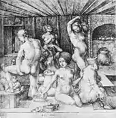 Bathing scenes were already in the Middle Ages a popular subject of painters. Most of the subjects were women shown nude, but the interest was probably less to the bathing itself rather than to provide the context for representing the nude figure. From the Middle Ages, illustrated books of the time contained such bathing scenes. Biblical and mythological themes which featured bathing were depicted by numerous painters. Especially popular themes included Bathsheba in the bath, in which she is observed by King David, and Susanna in the sight of lecherous old men.