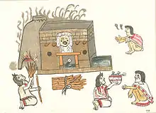 The Mesoamerican bath, known as temazcal in Spanish, from the Nahuatl word temazcalli, a compound of temaz ("steam") and calli ("house"), consists of a room, often in the form of a small dome, with an exterior firebox known as texictle (teʃict͜ɬe) that heats a small portion of the room's wall made of volcanic rocks; after this wall has been heated, water is poured on it to produce steam, an action known as tlasas. As the steam accumulates in the upper part of the room a person in charge uses a bough to direct the steam to the bathers who are lying on the ground, with which he later gives them a massage, then the bathers scrub themselves with a small flat river stone and finally the person in charge introduces buckets with water with soap and grass used to rinse. This bath had also ritual importance, and was vinculated to the goddess Toci; it is also therapeutic when medicinal herbs are used in the water for the tlasas. It is still used in Mexico.[4][5]