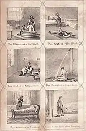 A popular revival followed the application of hydrotherapy around 1829, by Vincenz Priessnitz, a peasant farmer in Gräfenberg, then part of the Austrian Empire.[20] [21] This revival was continued by a Bavarian priest, Sebastian Kneipp (1821–1897), "an able and enthusiastic follower" of Priessnitz, "whose work he took up where Priessnitz left it", after he read a treatise on the cold water cure.[22] In Wörishofen (south Germany), Kneipp developed the systematic and controlled application of hydrotherapy for the support of medical treatment that was delivered only by doctors at that time. Kneipp's own book My Water Cure was published in 1886 with many subsequent editions, and translated into many languages.