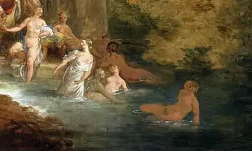 In the High Middle Ages, public baths were a popular subject of painting, with rather clear depictions of sexual advances, which probably were not based on actual observations. During the Renaissance and Baroque periods, the gods and nymphs of Greek mythology were depicted bathing in allegorical paintings by artists such as Titian and François Boucher, both of whom painted the goddess Diana bathing. Artists continued to paint Biblical characters bathing, and also sometimes depicted contemporary women bathing in the river, an example being Rembrandt's Woman Bathing.