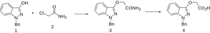 Use of chloroacetamide in the alkylation step, followed by acid hydrolysis produces bendazac (instead of benzydamine).