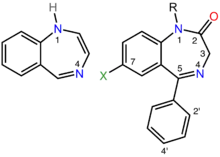Benzodiazepines (BZD, BDZ, BZs), sometimes called "benzos", are a class of psychoactive drugs whose core chemical structure is the fusion of a benzene ring and a diazepine ring. The first such drug, chlordiazepoxide (Librium), was discovered accidentally by Leo Sternbach in 1955, and made available in 1960 by Hoffmann–La Roche, which, since 1963, has also marketed the benzodiazepine diazepam (Valium).[1] In 1977 benzodiazepines were globally the most prescribed medications.[2] They are in the family of drugs commonly known as minor tranquilizers.[3]