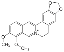 Berberine is a quaternary ammonium salt from the protoberberine group of benzylisoquinoline alkaloids found in such plants as Berberis, such as Berberis vulgaris (barberry), Berberis aristata (tree turmeric), Mahonia aquifolium (Oregon grape), Hydrastis canadensis (goldenseal), Xanthorhiza simplicissima (yellowroot), Phellodendron amurense (Amur cork tree),[2] Coptis chinensis (Chinese goldthread), Tinospora cordifolia, Argemone mexicana (prickly poppy), and Eschscholzia californica (Californian poppy). Berberine is usually found in the roots, rhizomes, stems, and bark.[3]