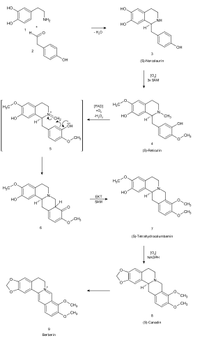 The alkaloid berberine has a tetracyclic skeleton derived from a benzyltetrahydroisoquinoline system with the incorporation of an extra carbon atom as a bridge. Formation of the berberine bridge is rationalized as an oxidative process in which the N-methyl group, supplied by S-adenosyl methionine (SAM), is oxidized to an iminium ion, and a cyclization to the aromatic ring occurs by virtue of the phenolic group.[10]