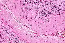 Bergmann glia (also known as radial epithelial cells, Golgi epithelial cells, or radial astrocytes) are unipolar astrocytes derived from radial glia that are intimately associated with Purkinje cells in the cerebellum.[9] Since bergmann glia appear to persist in the cerebellum, and perform many of the roles characteristic of astrocytes, they have also been called "specialized astrocytes."[8] Bergmann glia have multiple radial processes that extend across the molecular layer of the cerebellar cortex and terminate at the pial surface as a bulbous endfoot.[10] Bergmann glial cells assist with the migration of granule cells, guiding the small neurons from the external granular layer down to the internal granular layer along their extensive radial processes.[11][12] Besides their role in early development of the cerebellum, Bergmann glia are also required for synaptic pruning.[13] Following Purkinje cell death induced by CNS injury, Bergmann glia undergo extensive proliferative changes so as to replace lost or damaged tissue in a process known as gliosis.[14][15]