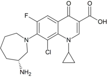 Besifloxacin (INN/USAN) is a fourth-generation fluoroquinolone antibiotic. The marketed compound is besifloxacin hydrochloride. It was developed by SSP Co. Ltd., Japan, and designated SS734. SSP licensed U.S. and European rights to SS734 for ophthalmic use to InSite Vision Incorporated (OTC Pink: INSV) in 2000. InSite Vision developed an eye drop formulation (ISV-403) and conducted preliminary clinical trials before selling the product and all rights to Bausch & Lomb in 2003.[1]