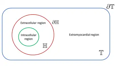 The bidomain domain is principally represented by two main regions: the cardiac cells, called intracellular domain, and the space surrounding them, called extracellular domain. Moreover, usually another region is considered, called extramiocardial region. The intracellular and extracellular domains, which are separate by the cellular membrane, are considered to be a unique physical space representing the heart (), while the extramyocardial domain is a unique physical space adjacent of them (). The extramyocardial region can be considered as a fluid bath, especially when one wants to simulate experimental conditions, or as a human torso to simulate physiological conditions.[12] The boundary of the two principal physical domains defined are important to solve the bidomain model. Here the heart boundary is denoted as while the torso domain boundary is [12]
