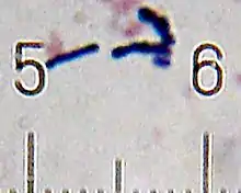Some of the Bifidobacterium animalis bacteria found in a sample of Activia yogurt:  The numbered ticks on the scale are 10 micrometres apart.