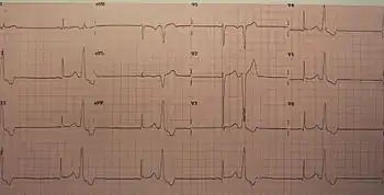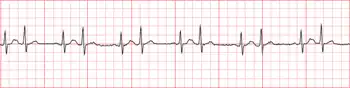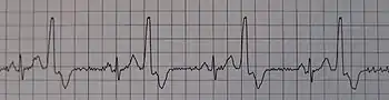Bigeminy is a cardiac arrythmia in which there is a single ectopic beat, or irregular heartbeat, following each regular heartbeat. Most often this is due to ectopic beats occurring so frequently that there is one after each sinus beat, or normal heartbeat. The two beats are figuratively similar to two twins (hence bi- + gemini). For example, in ventricular bigeminy, a sinus beat is shortly followed by a PVC, a pause, another normal beat, and then another PVC.[1] In atrial bigeminy, the other "twin" is a premature atrial contraction (PAC).