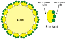 The dispersion of food fat into micelles provides a greatly increased surface area for the action of the enzyme pancreatic lipase, which actually digests the triglycerides, and is able to reach the fatty core through gaps between the bile salts.[6] A triglyceride is broken down into two fatty acids and a monoglyceride, which are absorbed by the villi on the intestine walls. After being transferred across the intestinal membrane, the fatty acids reform into triglycerides (re-esterified), before being absorbed into the lymphatic system through lacteals. Without bile salts, most of the lipids in food would be excreted in feces, undigested.[7]