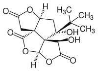 Bilobalide is important for producing several of the effects of Gingko biloba extracts, and it has neuroprotective effects,[3][4] as well as inducing the liver enzymes CYP3A1 and 1A2,[5] which may be partially responsible for interactions between gingko and other herbal medicines or pharmaceutical drugs. Bilobalide has recently been found to be a negative allosteric modulator at the GABAA and GABAA-rho receptors.[6] Of GABAA, it may possibly be selective for the subunits predominantly implicated in cognitive and memory functioning such as α1.