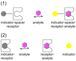 Chemical sensors,[13][14] are being developed for specific target molecules and ions in which the target (guest) form a complex with a sensor (host). The sensor is designed to be an excellent match in terms of the size and shape of the target in order to provide for the maximum binding selectivity. An indicator is associated with the sensor which undergoes a change when the target forms a complex with the sensor . The indicator change is usually a colour change (gray to yellow in the illustration) seen in absorbance or, with greater sensitivity, luminescence. The indicator may be attached to the sensor via a spacer, in the ISR arrangement, or it may be displaced from the sensor, IDA arrangement.
