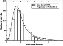 In macaque monkeys, measurements of microsaccadic eye movements and neuronal cell activity in the striate cortex have revealed an average frequency by which a precise duration (~0.5 seconds) of microsaccadic motion lead to a firing of a striate cortex neuron (indicating conscious motion perception).[4] The study revealed various parameters which controlled the rate of neuron firing, which were subsequently compared with different qualitative regimes of the quantum model. A PDDD of rivalry states was obtained by inputting the empirically derived time-scale durations of the microsaccades and oscillatory parameters into the proposed formulation. The generated distribution of perceptual state‐switching carried the same graphical shape as the data collected from experiments performed by Levelt (image, right).[1][4]