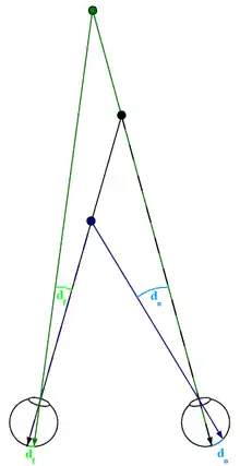 Figure 1: The full black circle is the point of fixation. The blue object lies nearer to the observer. Therefore, it has a "near" disparity dn. Objects lying more far away (green) correspondingly have a "far" disparity df. Binocular disparity is the angle between two lines of projection . One of which is the real projection from the object to the actual point of projection. The other one is the imaginary projection running through the nodal point of the fixation point.