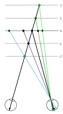 Researchers investigating precise properties of these neurons with respect to disparity present visual stimuli with different disparities to the cells and look whether they are active or not. One possibility to present stimuli with different disparities is to place objects in varying depth in front of the eyes. However, the drawback to this method may not be precise enough for objects placed further away as they possess smaller disparities while objects closer will have greater disparities. Instead, neuroscientists use an alternate method as schematised in Figure 2.