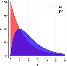 In pharmacology, in order to determine absolute bioavailability of a drug, a pharmacokinetic study must be done to obtain a plasma drug concentration vs time plot for the drug after both intravenous (iv) and extravascular (non-intravenous, i.e., oral) administration. The absolute bioavailability is the dose-corrected area under curve (AUC) non-intravenous divided by AUC intravenous. The formula for calculating the absolute bioavailability, F, of a drug administered orally (po) is given below (where D is dose administered).