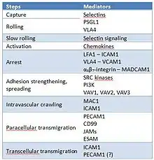 - Ley, K; Laudanna, C; Cybulsky, MI; Nourshargh, S (September 2007). "Getting to the site of inflammation: the leukocyte adhesion cascade updated". Nature Reviews. Immunology. 7 (9): 678–89. doi:10.1038/nri2156. PMID 17717539. S2CID 1871230.