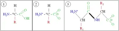 Generic amino acids (1) in neutral form, (2) as they exist physiologically, and (3) joined together as a dipeptide.