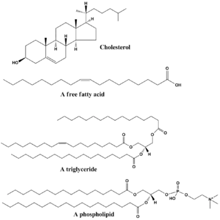 Structures of some common lipids. At the top are cholesterol and oleic acid.[38] The middle structure is a triglyceride composed of oleoyl, stearoyl, and palmitoyl chains attached to a glycerol backbone. At the bottom is the common phospholipid, phosphatidylcholine.[39]