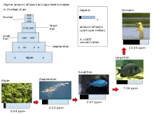 Biomagnification, also known as bioamplification or biological magnification, is any concentration of a toxin, such as pesticides, in the tissues of tolerant organisms at successively higher levels in a food chain.[1] This increase can occur as a result of: