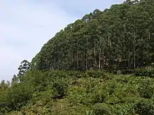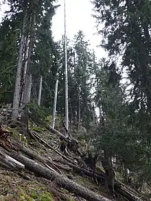 Research show that old trees absorb more CO2 than young trees, because of the larger leaf area in full grown trees.[41] However, the old forest (as a whole) will eventually stop absorbing CO2 because CO2 emissions from dead trees cancel out the remaining living trees’ CO2 absorption.[lower-alpha 9] The old forest (or forest stands) are also vulnerable for natural disturbances that produces CO2. The IPCC writes: «When vegetation matures or when vegetation and soil carbon reservoirs reach saturation, the annual removal of CO2 from the atmosphere declines towards zero, while carbon stocks can be maintained (high confidence). However, accumulated carbon in vegetation and soils is at risk from future loss (or sink reversal) triggered by disturbances such as flood, drought, fire, or pest outbreaks, or future poor management (high confidence).»[42] Summing up, IPCC writes that «[…] landscapes with older forests have accumulated more carbon but their sink strength is diminishing, while landscapes with younger forests contain less carbon but they are removing CO2 from the atmosphere at a much higher rate [...].»[43] Regarding soil carbon, the IPCC writes: «Recent studies indicate, that effects of forest management actions on soil C [carbon] stocks can be difficult to quantify and reported effects have been variable and even contradictory (see Box 4.3a).» Because the «current scientific basis is not sufficient», the IPCC will not currently provide soil carbon emission factors for forest management.[44]