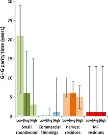Some research groups still argue that even if the European and North American forest carbon stock is increasing, it simply takes too long for harvested trees to grow back. EASAC for instance argues that since the world is on track to pass by the agreed target of 1.5 degrees temperature increase already in a decade or so, CO2 from burnt roundwood, which resides in the atmosphere for many decades before being re-absorbed, make it harder to achieve this goal. They therefore suggest that the EU should adjust its sustainability criteria so that only renewable energy with carbon payback times of less than 10 years is defined as sustainable,[lower-alpha 12] for instance wind, solar, biomass from wood residues and tree thinnings that would otherwise be burnt or decompose relatively fast, and biomass from short rotation coppicing (SRC).[51] Chatham House agrees, and in addition argues that there could be tipping points along the temperature scale where warming accelerates.[lower-alpha 13] Chatham House also argues that various types of roundwood (mostly pulpwood) is used in pellet production in the USA.[52]