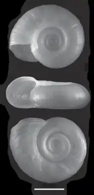 The shell of this species, like all planorbids is sinistral in coiling, but is carried upside down and thus appears to be dextral.