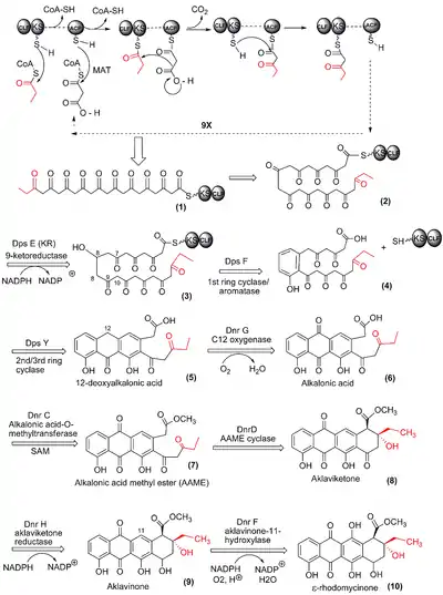 The anthracycline skeleton of doxorubicin (DXR) is produced by a Type II polyketide synthase (PKS) in streptomyces peucetius. First, a 21-carbon decaketide chain (Fig 1. (1)) is synthesized from a single 3-carbon propionyl group from propionyl-CoA, and 9 2-carbon units derived from 9 sequential (iterative) decarboxylative condensations of malonyl-CoA. Each malonyl-CoA unit contributes a 2-carbon ketide unit to the growing polyketide chain. Each addition is catalyzed by the "minimal PKS" consisting of an acyl carrier protein (ACP), a ketosynthase (KS)/chain length factor (CLF) heterodimer and a malonyl-Coa:ACP acyltransferase(MAT). (refer to top of Figure 10.