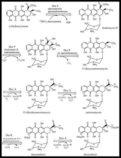 After the 21-carbon decaketide chain of DXR is completed, successive modifications are made to eventually produce a tetracyclic anthracycline aglycone (without glycoside attached).[8] The daunosamine amino sugar, activated by addition of Thiamine diphosphateTDP, is created in another series of reactions.[9] It is joined to the anthracycline aglycone and further modifications are done to produce first daunorubicin then DXR.[10] There are at least 3 gene clusters important to DXR biosynthesis: dps genes which specify the enzymes required for the linear polyketide chain synthesis and its first cyclizations, the dnr cluster is responsible for the remaining modifications of the anthracycline structure and the dnm genes involved in the amino sugar, daunosamine, synthesis. Additionally, there is a set of "self resistance" genes to reduce the toxic impact of the anthracycline on the producing organism. One mechanism is a membrane pump that causes efflux of the DXR out of the cell (drr loci).[11] Since these complex molecules are only advantageous under specific conditions, and require a lot of energy to produce, their synthesis is tightly regulated.[12]