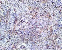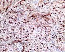 - Mucosal melanoma: Also a spindled cell tumor in many cases, but there is pleomorphism (more variety in shape/size of tumor cells,) intranuclear inclusions and prominent nucleoli. The neoplastic cells are usually strongly reactive with S100 protein, SOX10, HMB45, Melan-A, tyrosinase, while negative for SMA, MSA.
