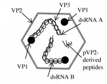 RNA-directed RNA polymerase (VP1), which lacks the highly conserved Gly-Asp-Asp (GDD) sequence, a component of the proposed catalytic site of this enzyme family that exists in the conserved motif VI of the palm domain of other RNA-directed RNA polymerases.[4]