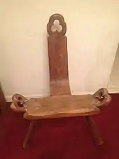 The birthing chair has been used for millennia. It appears in the Bible's observation: ‘And he said, ‘When ye do the office of a midwife to the Hebrew women and see them upon the birthstool’ (Exodus 1:16). Birthing chairs took the place of laboring mothers sitting on birth attendant’s laps, as it was the previous practice. These chairs were used before male physicians dominated the delivery room.[2] The use of the birthing chair or similar devices has been seen around the globe, not isolated to a particular region. A woman giving birth in the upright position has been seen in Asian, African, Pacific Islander, and Native American art. The birthing chair can be traced to Egypt in the year 1450 B.C.E. Pictured on the walls of The Birth House at Luxor, Egypt, is an Egyptian queen giving birth on a stool. It can also be traced to Greece in 200 B.C as it is featured on an ancient Grecian sculpted votive.[1] Celtic items from 100 B.C.E in Britain also depict women sitting in the same upright position as if in a birthing chair. The first depiction in a woodcut from the 16thc shows a woman sitting on a stool and surrounded by other women.[3] The three legged birth stool, sometimes called a groaning stool, was designed to be carried disassembled, and sits low to the ground. Some examples, such as this continental birthing chair, are adjustable with the back extending so the woman could move from an upright position to a reclined position.[4]