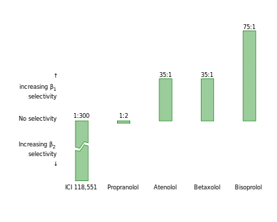 Bisoprolol has a higher degree of β1-selectivity compared to other β1-selective beta blockers such as atenolol, metoprolol, and betaxolol.[22][23][24][25][26][27][28][29][30][31] However nebivolol is approximately 3.5 times more β1-selective.[32][33]