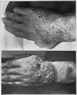 Blastomycosis was first described by Thomas Casper Gilchrist in 1894; because of this, it is sometimes called "Gilchrist's disease".[11] It is also sometimes referred to as Chicago Disease. Other names for blastomycosis include North American blastomycosis, and blastomycetic dermatitis.[1]