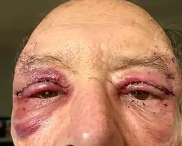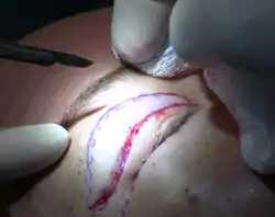 Blepharoplasty (Greek: blepharon, "eyelid" + plassein "to form") is the plastic surgery operation for correcting defects, deformities, and disfigurations of the eyelids; and for aesthetically modifying the eye region of the face. With the excision and the removal, or the repositioning (or both) of excess tissues, such as skin and adipocyte fat, and the reinforcement of the corresponding muscle and tendon tissues, the blepharoplasty procedure resolves functional and cosmetic problems of the periorbita, which is the area from the eyebrow to the upper portion of the cheek. The procedure is more common among women, who accounted for approximately 85% of blepharoplasty procedures in 2014 in the US and 88% of such procedures in the UK.[1][2]