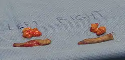 Blepharoplasty: The yellow fat (adipose tissue) and the skin (linear tissue) removed during a quadruple blepharoplasty. The fat from the lower eyelid was removed with a transconjunctival technique.