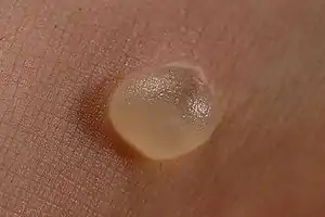 A blister is a small pocket of body fluid (lymph, serum, plasma, blood, or pus) within the upper layers of the skin, usually caused by forceful rubbing (friction), burning, freezing, chemical exposure or infection. Most blisters are filled with a clear fluid, either serum or plasma.[1] However, blisters can be filled with blood (known as "blood blisters") or with pus (for instance, if they become infected).