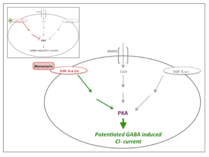| Blonanserin action at dopamine-D3 receptor. Cartoon of blonanserin's antagonistic impact at the dopamine-D3 receptor, reversing inhibition of PKA activity (also regulated by dopamine-D1 and NMDA activity) thus potentiating GABA induced Cl- current. Inset illustrates uninterrupted dopamine (DA) activity at the dopamine-D3 receptor. Inspired by Hida et al. (2014) and Yokota et al. (2002).[9][13] |