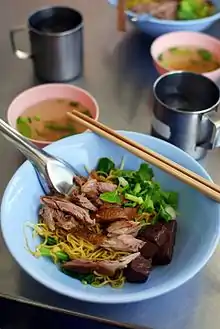 Coagulated chicken, duck, goose or pig blood is used in soups, such as the classic Thai dish Tom Lued Moo (pork blood soup). Thailand also has a dish known as Nam Tok, which is a spicy soup stock enriched with raw cow or pig's blood. It is often used to enrich regular noodle dishes, as well as in Khao soi.[24]