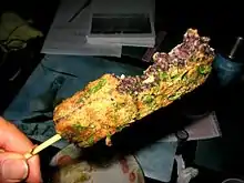 Aside from dinuguan, a native blood sausage known as pinuneg also exists among the Kankanaey people of the highlands of Luzon.[19][20] Cubes of pork blood grilled on skewers is also a common street food throughout the Philippines. These are known colloquially as "betamax" (after its resemblance to Betamax tapes).[21]