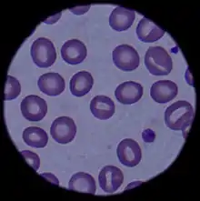 Red and white human blood cells as seen under a microscope using a blue slide stain