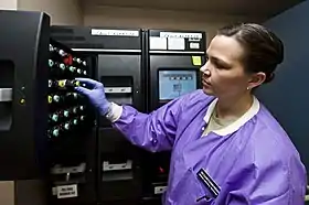 ![]() A laboratory worker unloads blood culture bottles from a BACT/Alert machine, an automated system used to incubate blood cultures and detect microbial growth | |