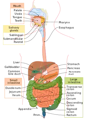 | The transition from the upper to lower GI tract is considered to occur at the duodenal-jejunal junction,[1] therefore small intestine is part of both the upper and lower GI tract. Other organs participate in digestion including the liver, gallbladder, and pancreas.[2] Blood entering the upper GI tract travels further, therefore has more exposure to the GI system and can be partially digested into melena before leaving the system.[3] Hematochezia generally occurs lower in the GI tract, and is much closer to its exit, although fast bleeds can occur in the upper system as well.[3]]] Bleeding of the lower GI tract will typically appear as hematochezia and can vary in degree of seriousness.[4] Slow bleeding from the ascending portion of the colon can result in partial digestion of the blood and the appearance of melena in the stool.[5] | |