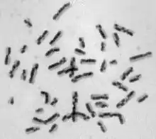 Bloom syndrome is an autosomal recessive disorder, caused by mutations in the maternally- and paternally-derived copies of the gene BLM.[13] As in other autosomal recessive conditions, the parents of an individual with Bloom syndrome do not necessarily exhibit any features of the syndrome. The mutations in BLM associated with Bloom syndrome are nulls and missense mutations that are catalytically inactive.[14] The cells from persons with Bloom syndrome exhibit a striking genomic instability that is characterized by hyper-recombination and hyper-mutation. Human BLM cells are sensitive to DNA damaging agents such as UV and methyl methanesulfonate,[15] indicating deficient repair capability. At the level of the chromosomes, the rate of sister chromatid exchange in Bloom's syndrome is approximately 10 fold higher than normal and quadriradial figures, which are the cytologic manifestations of crossing-over between homologous chromosome, are highly elevated. Other chromosome manifestations include chromatid breaks and gaps, telomere associations, and fragmented chromosomes.[16] The hyper-recombination can also be detected by molecular assays [17] The BLM gene is a member of the protein family referred to as RecQ helicases. The diffusion of BLM has been measured to 1.34 in nucleoplasm and 0.13 at nucleoli [18] DNA helicases are enzymes that attach to DNA and temporarily unravel the double helix of the DNA molecule. DNA helicases function in DNA replication and DNA repair. BLM very likely functions in DNA replication, as cells from persons with Bloom syndrome exhibit multiple defects in DNA replication, and they are sensitive to agents that obstruct DNA replication.[9]