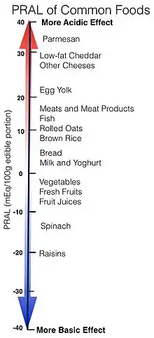 When more sulfur containing amino acids, methionine and cystine, are consumed than the body can use for growth and repair, they are broken down yielding sulfate, or sulfuric acid among other products. Animal foods such as meat, dairy, and eggs are high in protein and “dietary animal protein intake is highly correlated with renal net acid excretion”.[6] Research dating back to the early 1900s has shown correlations between high protein diets and increased acid excretion.[7] One measure of the acidic or basic effects foods have in the body is Potential Renal Acid Load (PRAL). Cheeses with protein content of 15 g protein/100g or higher have a high PRAL value of 23.6 mEq/100 g edible portion. Meats, fish, other cheeses and flour or noodles all have a PRAL around 8.0 mEq/100 g edible portion, where fruits and vegetables actually have a negative PRAL.[1][8]
