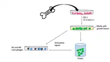 In order to produce BMDMs, mesenchymal stem cells are removed from the tibia or femur of mice.[6] Since BMDMs are derived from bone marrow, withdrawn cells are healthy and naïve (or unactivated), regardless of the condition of donor mice.[5] After removal, stem-cells are incubated with CSF-1.[6] Without CSF-1, the cells enter an inactive state but can reinitiate growth and differentiation if stimulated later.[6] Mature macrophages and fibroblasts, which may carry unwanted growth factors, are removed.[6] Next, IL-3 and IL-1, two growth factors, are often added to increase yield and promote rapid terminal differentiation.[6] Exogenous media containing growth factors and other serums must also be added to make the cells continually viable.[6] Full growth and differentiation take approximately 5–8 days.[6]