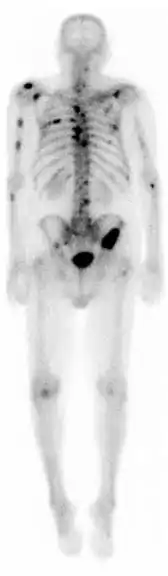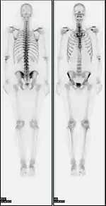 ![]() A nuclear medicine whole-body bone scan. The nuclear medicine whole-body bone scan is generally used in evaluations of various bone-related pathology, such as for bone pain, stress fracture, nonmalignant bone lesions, bone infections, or the spread of cancer to the bone. | |