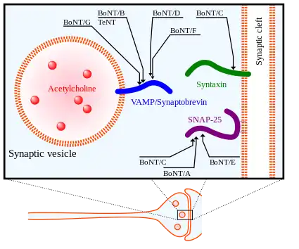 Botulinum toxin exerts its effect by cleaving key proteins required for nerve activation. First, the toxin binds specifically to nerves that use the neurotransmitter acetylcholine. Once bound to the nerve terminal, the neuron takes up the toxin into a vesicle by receptor-mediated endocytosis.[51] As the vesicle moves farther into the cell, it acidifies, activating a portion of the toxin that triggers it to push across the vesicle membrane and into the cell cytoplasm.[1] Once inside the cytoplasm, the toxin cleaves SNARE proteins (proteins that mediate vesicle fusion, with their target membrane bound compartments) meaning that the acetylcholine vesicles cannot bind to the intracellular cell membrane,[51] preventing the cell from releasing vesicles of neurotransmitter. This stops nerve signaling, leading to paralysis.[1]