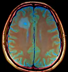 Brain abscess (or cerebral abscess) is an abscess caused by inflammation and collection of infected material, coming from local (ear infection, dental abscess, infection of paranasal sinuses, infection of the mastoid air cells of the temporal bone, epidural abscess) or remote (lung, heart, kidney etc.) infectious sources, within the brain tissue. The infection may also be introduced through a skull fracture following a head trauma or surgical procedures. Brain abscess is usually associated with congenital heart disease in young children. It may occur at any age but is most frequent in the third decade of life.