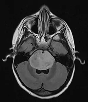 A brainstem glioma is a cancerous glioma tumor in the brainstem. Around 75% are diagnosed in children and young adults under the age of twenty, but have been known to affect older adults as well.[1] Brainstem gliomas start in the brain or spinal cord tissue and typically spread throughout the nervous system.[2]